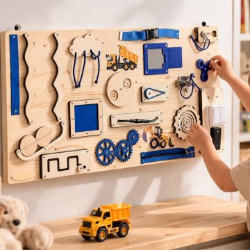 Fascinují vaše dítě velké stroje, bagry a traktory? Náš Activity board s motivem staveniště promění dětský pokoj v kreativní dílnu. Na ploše 40x80 cm najdou malí stavitelé vše, co potřebují k tréninku svých šikovných prstíků – od točících se ozubených kol, která připomínají soukolí strojů, až po funkční zámky a světýlka.