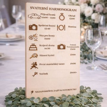 Svatební harmonogram Váš svatební den v dokonalém přehledu a stylu Svatební den uteče jako voda a vy si zasloužíte, aby každý moment proběhl hladce. Náš dřevěný svatební harmonogram není jen krásnou dekorací, ale především praktickým průvodcem pro vaše hosty. Díky němu bude každý vědět, kdy se krájí dort, kdy začíná první tanec a kdy vypukne ta pravá zábava. Vyřezávaný z kvalitní březové překližky s elegantním gravírováním, tento harmonogram dokonale podtrhne atmosféru boho, rustikální i moderní svatby. Zapomeňte na neustálé dotazy hostů – s tímto přehledným plánem vnesete do svého velkého dne klid, eleganci a řád, který oceníte vy i vaši blízcí. Proč zvolit náš dřevěný harmonogram? Informativní krása: Hosté mají dokonalý přehled a vy máte čas si svůj den užít. Nezničitelná památka: Na rozdíl od papíru vám tento plán zůstane jako vzpomínka navždy. Přírodní design: Světlé dřevo ladí s květinami, krajkou i jutou. Precizní česká práce: Vyrobeno s důrazem na detail v naší dílně ActivityBoard.cz. Podstavec je součástí. 349,00 Kč https://activityboard.cz/zivotni-udalosti/267-svatebni-harmonogram.html">Svatební harmonogram Cena 4.9 42 asd rty ewr